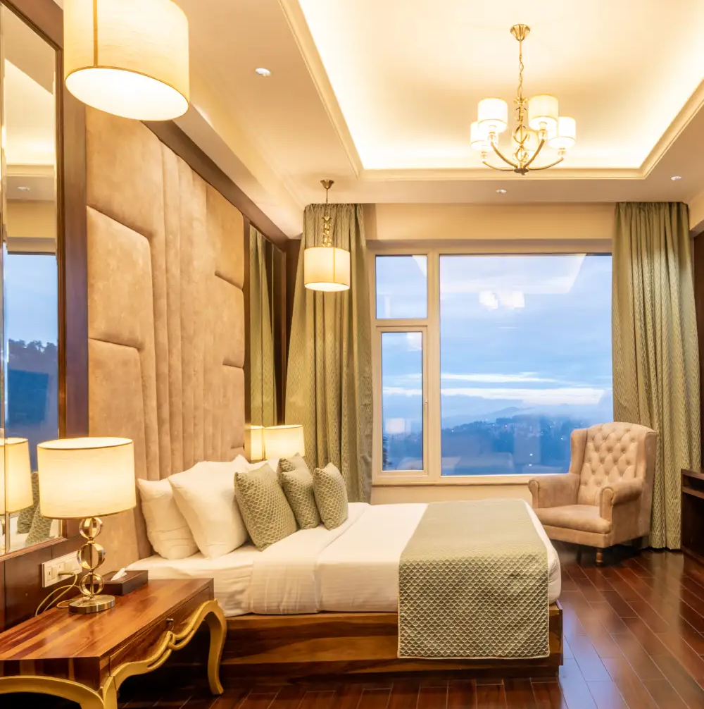 Nestled in the serene hills of Chail, Shakuntalam Skyscrapers redefines luxury living amidst nature. These 1BHK and 3BHK residences are thoughtfully designed to offer comfort, elegance, and exclusivity. Each home comes fully equipped with high-end finishes — from wooden flooring and a premium modular kitchen to spacious wardrobes, a stylish dressing area, and elegant lighting fixtures including jhumars and fancy lights. Enjoy a private balcony with breathtaking mountain views, unwind in your personal jacuzzi, or relax in a tastefully furnished space complete with a cozy bed and TV. At Shakuntalam Skyscrapers, every detail reflects sophistication and tranquility — creating your perfect luxury retreat in the heart of Himachal Pradesh.